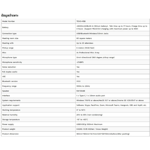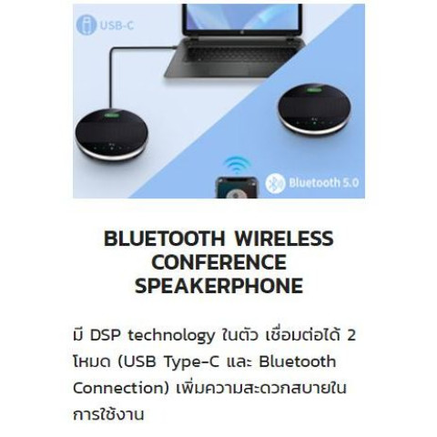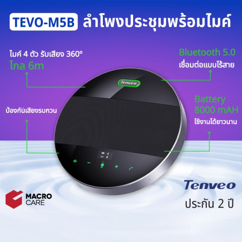 TEVO-M5B Conference Speakerphone (Tenveo) ลำโพงประชุมออนไลน์พร้อมไมค์ในตัว สำหรับห้องประชุม โต๊ะประชุม หรือ WFH ที่ต้องการเสียงคมชัดทั้งขาเข้าและขาออก เชื่อมต่อได้ทั้ง Bluetooth 5.0 และ USB Type-C พร้อมเทคโนโลยี DSP, Noise Reduction และ Acoustic Echo Cancellation เพื่อการคุยแบบ Full Duplex ที่ลื่นไหล ไม่สะท้อน ไม่ตัดคำ เหมาะกับการประชุมผ่าน Zoom, Microsoft Teams, Google Meet และแพลตฟอร์มอื่นๆ