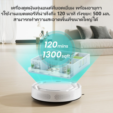 ชาร์จอัตโนมัติ ใช้งานได้นานสูงสุด 120 นาที (โหมดเงียบ) เมื่อทำงานเสร็จหรือแบตเหลือประมาณ 15% จะกลับแท่นชาร์จเอง ชาร์จเต็มภายใน 3–4 ชั่วโมง