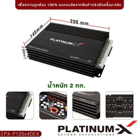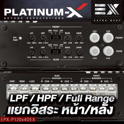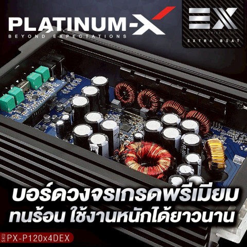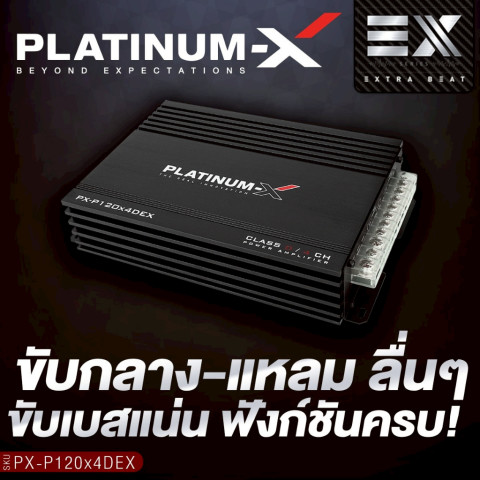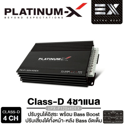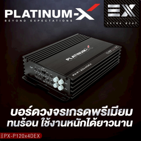 สัมผัสพลังเสียงคมชัด เต็มรายละเอียด กับ PLATINUM-X เพาเวอร์แอมป์ คลาสดี รุ่น PX-P120x4DEX CLASS D 4CH เพาเวอร์แอมป์ 4 แชนแนลกำลังสูง ออกแบบมาเพื่อขับชุดเสียงกลางและเสียงแหลมโดยเฉพาะ ให้โทนเสียงใส เคลียร์ มีมิติ และให้พลังขับอย่างเต็มประสิทธิภาพ เหมาะสำหรับผู้ที่ต้องการอัปเกรดชุดเครื่องเสียงรถยนต์ให้ให้ได้ทั้งความดังและความคมชัดในเวลาเดียวกัน ในราคาเพียง 2,100 บาท