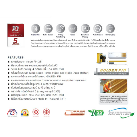 รับประกันอะไหล่ 5 ปี และคอมเพรสเซอร์ยาวนาน 10 ปี