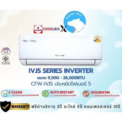 แอร์ติดผนัง CENTRAL AIR รุ่น IVJS SERIES (ระบบอินเวอร์เตอร์) #5 R32 ขนาด 9,500-26,000 BTU เหมาะสำหรับทั้งบ้านและคอนโดที่ต้องการความเย็นสบายต่อเนื่อง ประหยัดพลังงาน พร้อมฟังก์ชันครบ ใช้งานง่าย และดีไซน์ทันสมัยเข้ากับทุกสไตล์การตกแต่ง