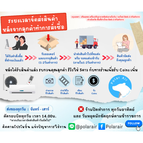 กรณีสินค้าเสียหาย, ชำรุด, ส่งผิดรุ่น หรือแตกหัก สามารถติดต่อผ่านช่องแชท หรือ Line @polarair เพื่อรับการดูแลจากทีมงาน