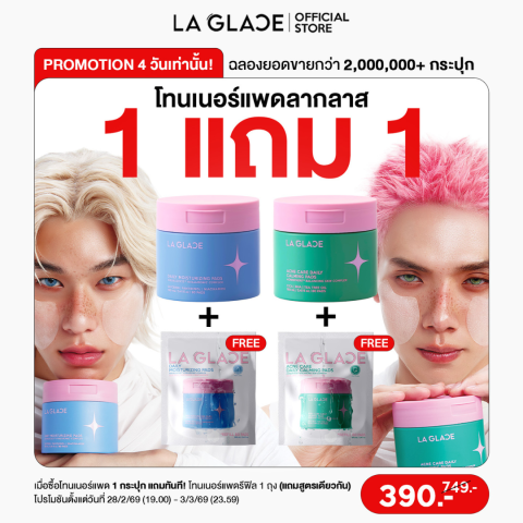 โปร1แถม1! LA GLACE DAILY TONER PADS โทนเนอร์แพดลากลาส 1 กระปุก แถม 1 รีฟิล (สูตร Moist & Acne แถมสูตรเดียวกัน) ไอเทมดูแลผิวแบบง่ายๆ ที่ช่วยเช็ดปรับสภาพผิว เติมความชุ่มชื้น พร้อมดูแลปัญหาสิวในขั้นตอนเดียว เหมาะสำหรับวันเร่งรีบหรือคนที่อยากได้ผิวเนียนใสแบบไม่ยุ่งยาก