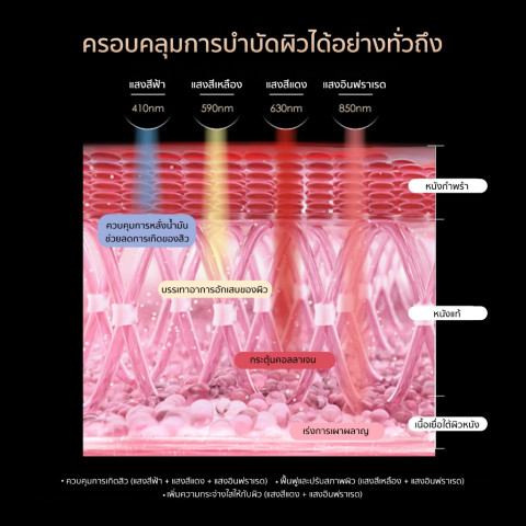 แสงสีแดง – ช่วยกระตุ้นการสร้างคอลลาเจน ลดเลือนริ้วรอย ทำให้ผิวแลดูกระชับ เรียบเนียน