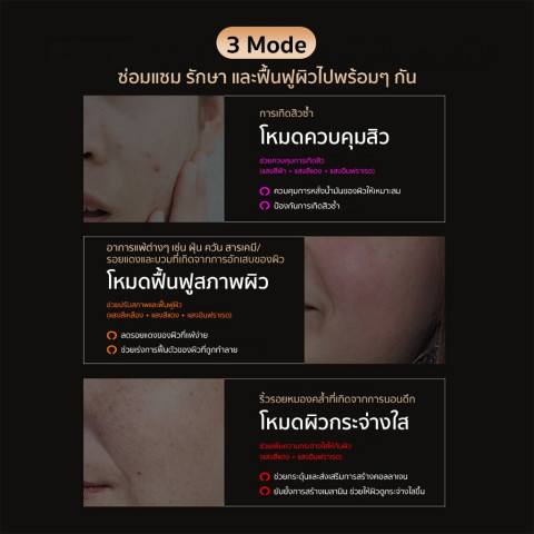 โหมดให้เลือก 3 โหมด ครอบคลุมการดูแลผิวหลัก: โหมดลดสิว โหมดฟื้นฟูผิว และโหมดเพิ่มความกระจ่างใส