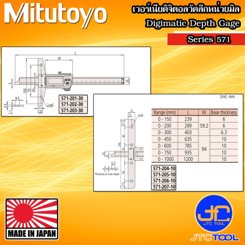 Mitutoyo เวอร์เนียดิจิตอลวัดลึกเฉพาะหน่วยมิล รุ่น 571 - Vernier Digital Depth Gauge Series 571 รุ่น 571-202-30 คือเครื่องมือวัดความลึกคุณภาพสูงจากแบรนด์ระดับโลกอย่าง Mitutoyo ที่ออกแบบมาเพื่อการวัดที่แม่นยำ ใช้งานสะดวก และรองรับการทำงานในสายการผลิต งานเครื่องกล งานซ่อมบำรุง และงานตรวจสอบคุณภาพชิ้นงานที่ต้องการความละเอียดสูง