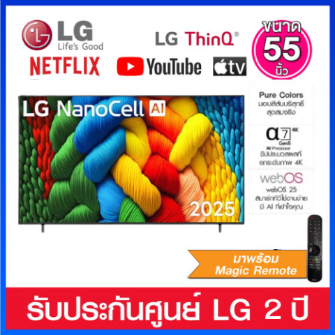 เติมเต็มประสบการณ์ความบันเทิงภายในบ้านของคุณด้วย LG NANO CELL 4K Smart TV ขนาด 55 นิ้ว รุ่น 55NANO80ASA ทีวีที่ผสานเทคโนโลยีภาพและเสียงล้ำสมัยเข้าด้วยกันอย่างลงตัว มอบภาพคมชัดระดับ 4K สีสันสดใสสมจริง พร้อมระบบอัจฉริยะที่เข้าใจคุณได้มากกว่าที่เคย