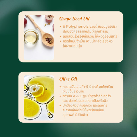 Grape Seed Oil (น้ำมันเมล็ดองุ่น) อุดมด้วย Polyphenols สารต้านอนุมูลอิสระชั้นเยี่ยม ช่วยชะลอการเกิดริ้วรอย ปกป้องคอลลาเจนและผิวจากความหมองคล้ำ พร้อมกักเก็บความชุ่มชื้นให้ผิวเนียนนุ่มและดูอ่อนเยาว์
