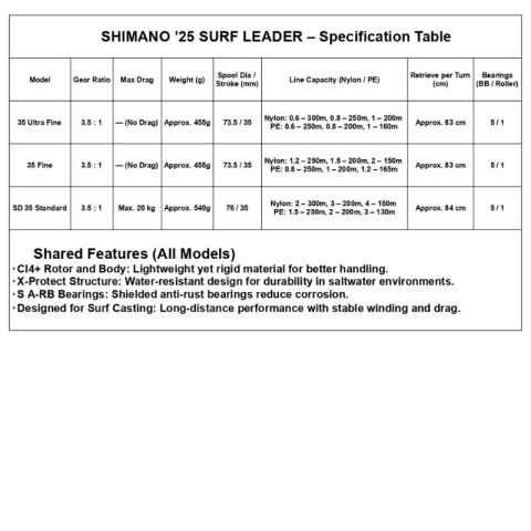 SHIMANO '25 SURF LEADER Spinning Reel 35 GOKUHOSO / 35 HOSO / SD 35 HYOUJYUN | Long Cast Surf Reel – รอกสปินนิ่งยิงเหยื่อไกลสำหรับสายหน้าดินและชายฝั่ง ที่ออกแบบมาเพื่อคนรักการตีเหยื่อระยะไกลโดยเฉพาะ รุ่นปี 2025 ใหม่ล่าสุดจาก SHIMANO ผสานเทคโนโลยีล้ำสมัยเพื่อความไกล ความแม่นยำ และความทนทานสูงสุด