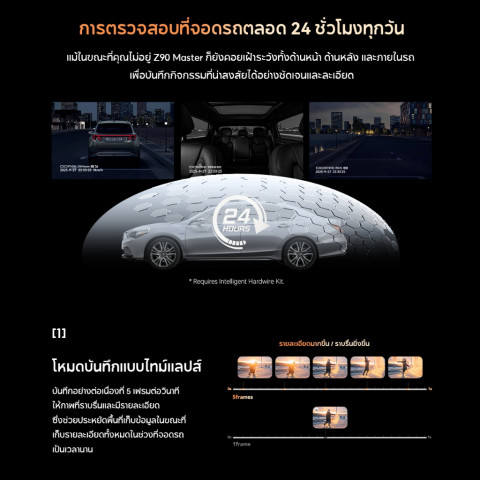 Z90 รองรับการบันทึกขณะจอดรถตลอด 24 ชั่วโมง เมื่อใช้งานร่วมกับชุดสายต่อไฟตรง (Intelligent Hardwire):Time-Lapse Recording – บันทึกแบบเร่งเวลา ประหยัดพื้นที่จัดเก็บแต่ยังเห็นทุกความเคลื่อนไหว