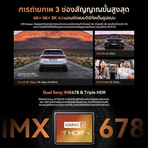 รุ่น Z90 มาพร้อมระบบกล้องหน้าคมชัดระดับ 4K HDR และกล้องหลังความละเอียดสูง 2K HDR (รองรับเพิ่มกล้องในห้องโดยสาร 3K HDR สำหรับเวอร์ชัน 3CH) พร้อมหน่วยความจำในตัวแบบ eMMC 64GB ช่วยให้บันทึกได้อย่างต่อเนื่องและเสถียรยิ่งขึ้น โดยไม่ต้องกังวลเรื่องการ์ดเสียหายง่ายเหมือนกล้องทั่วไป