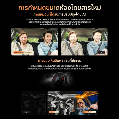 กล้องหลังความละเอียด 2K HDR ช่วยบันทึกเหตุการณ์ด้านหลังอย่างคมชัดทั้งกลางวันและกลางคืน เหมาะกับการใช้งานกรณีถูกชนท้าย หรือเมื่อต้องใช้หลักฐานจากด้านหลังรถ ภาพที่ได้มีความชัดเจนเพียงพอสำหรับการอ้างอิงกับบริษัทประกันหรือเจ้าหน้าที่ตำรวจกล้องภายในห้องโดยสาร 3K HDR พร้อม AI Portrait และอินฟราเรด (เฉพาะรุ่น 3CH)