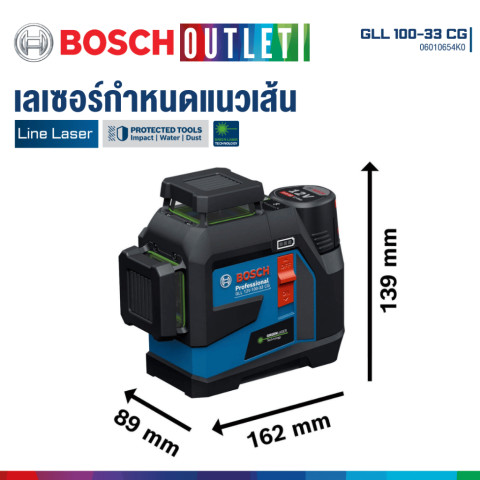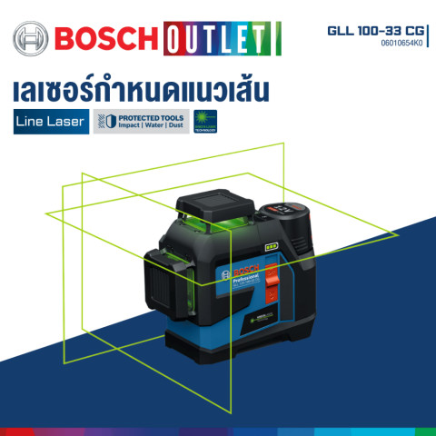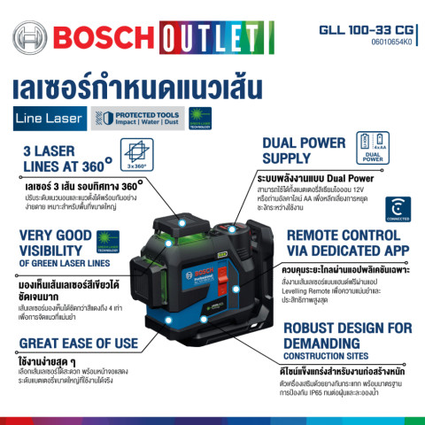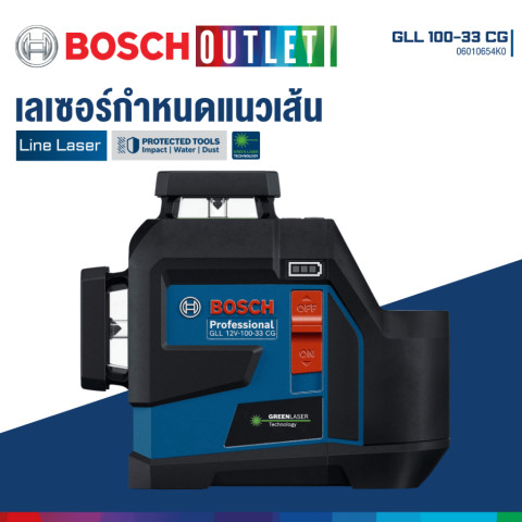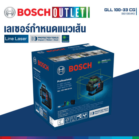 BOSCH GLL 100-33 CG เลเซอร์กำหนดแนวเส้น เลเซอร์วัดระดับแสงสีเขียว รุ่น GLL 12V-100-33 CG Professional เลเซอร์ไลน์ระดับมืออาชีพที่ออกแบบมาเพื่อการทำงานหน้างานจริงโดยเฉพาะ โดดเด่นด้วยแสงเลเซอร์สีเขียวที่สว่าง คมชัด มองเห็นได้ดีในพื้นที่ที่มีแสงมาก พร้อมลำแสงรอบตัว 360° จำนวน 3 ลำแสง ครอบคลุมทั้งแนวตั้งและแนวนอน ช่วยให้การวัดระดับ ตีเส้นกำหนดแนว และงานติดตั้งต่าง ๆ ทำได้รวดเร็ว แม่นยำ และลดข้อผิดพลาดในการทำงาน เหมาะสำหรับช่างมืออาชีพ วิศวกร ผู้รับเหมา และงานติดตั้งภายใน-ภายนอกอาคาร