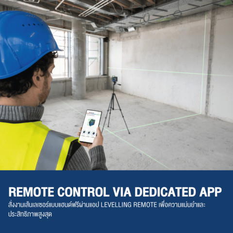 ควบคุมเส้นเลเซอร์ 3 x 360° ผ่านแอป Levelling Remote ช่วยให้การตั้งระดับเป็นเรื่องง่าย ลดการขึ้น-ลงบันไดหรือปรับเครื่องมือบ่อยครั้ง