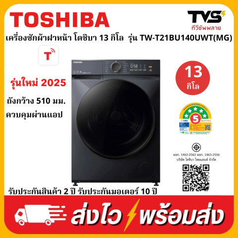 TOSHIBA เครื่องซักผ้าฝาหน้า 13 กก. รุ่น TW-T21BU140UWT(MG) ถังกว้างพิเศษ ควบคุมผ่านแอป ซักสะอาดล้ำลึก พร้อมฟังก์ชันดูแลผ้าและสุขอนามัยครบ จบในเครื่องเดียว เหมาะสำหรับครอบครัวที่ต้องการทั้งความสะดวก ประหยัด และถนอมเนื้อผ้าในทุกวัน