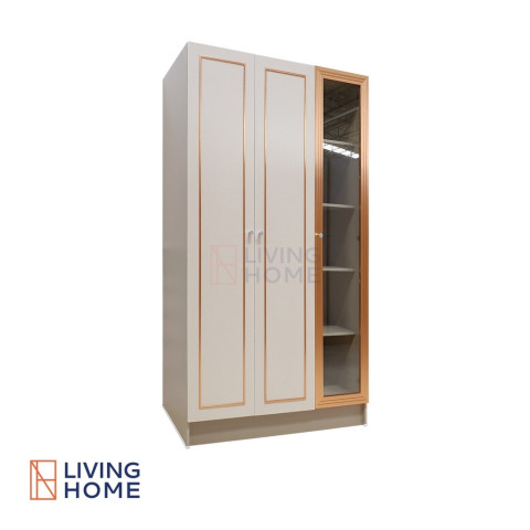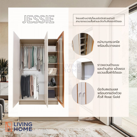 ตู้เสื้อผ้า 3 บานเปิดมีชั้นวางของ รุ่น JESSIE โทนสีครีมตัดแซนสโตน สวยละมุนสไตล์มินิมอล ช่วยจัดระเบียบเสื้อผ้าและของใช้ให้เป็นสัดส่วน เหมาะทั้งห้องนอน บ้าน คอนโด หรือห้องแต่งตัว โดยมาพร้อมบานกระจกใสแบบยาว 1 บาน ช่วยให้แต่งตัวสะดวกและยังใช้โชว์ของได้อย่างลงตัว