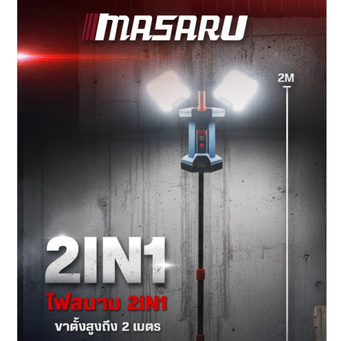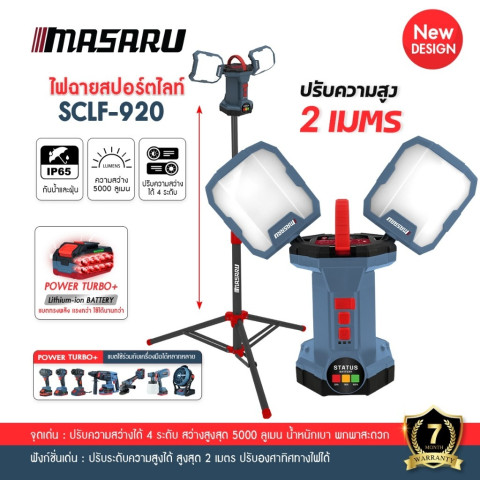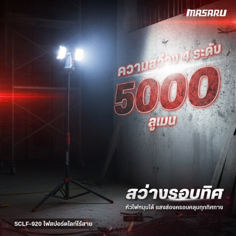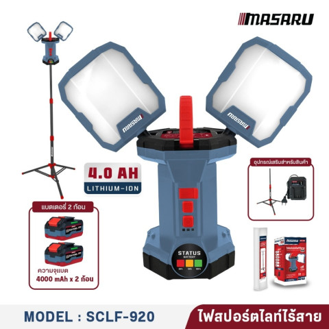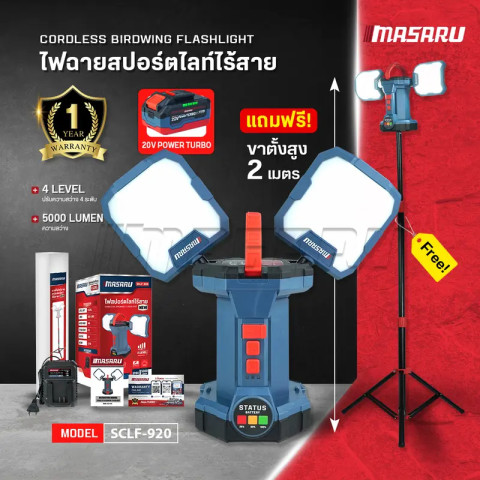 MASARU รุ่น SCLF-920 ไฟสปอร์ตไลท์ 2 ทิศทาง ไฟสนาม 2IN1 ขาตั้งสูง 2 เมตร ปรับความสว่างได้ 4 ระดับ ราคา 4,379.27 บาท ให้แสงขาวคมชัด 6500K สว่างครอบคลุมรอบทิศ เหมาะสำหรับงานช่าง หน้างานก่อสร้าง ลานจอดรถ แคมป์ปิ้ง หรือใช้เป็นไฟสำรองฉุกเฉิน ใช้งานแบบไร้สายคล่องตัว พร้อมพอร์ต USB ชาร์จอุปกรณ์ได้ระหว่างใช้งาน