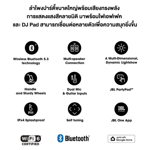 ลำโพงบลูทูธ | WiFi กลางแจ้ง Partybox Ultimate Bluetooth | WiFi Speaker คือคำตอบสำหรับปาร์ตี้และอีเวนต์ที่ต้องการ “ทั้งพลังเสียงและบรรยากาศ” แบบจัดเต็มในเครื่องเดียว ด้วย JBL PartyBox Ultimate ลำโพงปาร์ตี้ระดับเรือธงที่ให้กำลังขับสูงสุด 1100 วัตต์ RMS กระหึ่มเต็มพื้นที่ พร้อมยกระดับมิติเสียงให้สมจริงยิ่งขึ้นด้วย Dolby Atmos ผ่านการเชื่อมต่อ Wi‑Fi เหมาะสำหรับพื้นที่ขนาดใหญ่ ทั้งกลางแจ้งและในร่ม