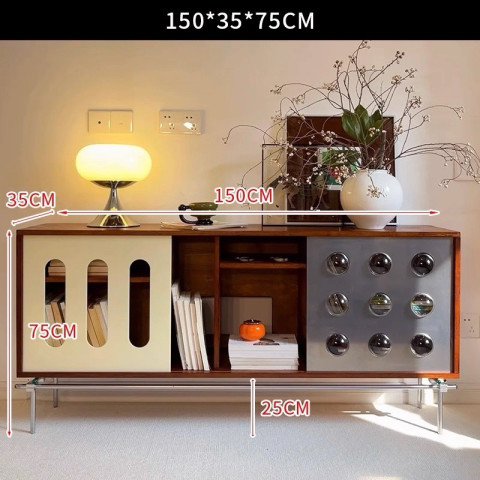 ขนาดกำลังดี 150×35×75 ซม. วางได้ทั้งห้องนั่งเล่น มุมทำงาน หรือปลายเตียง เพิ่มความโมเดิร์นปนวินเทจให้พื้นที่ทันที โครงสร้างแข็งแรงด้วย โครงเหล็กขัดเงา พร้อมฐานรองมั่นคง รับน้ำหนักได้ดี และมีช่องจัดเก็บหลากหลายขนาด ช่วยจัดระเบียบหนังสือ ของแต่งบ้าน หรือของใช้ต่าง ๆ ให้ดูเรียบร้อยและมีสไตล์