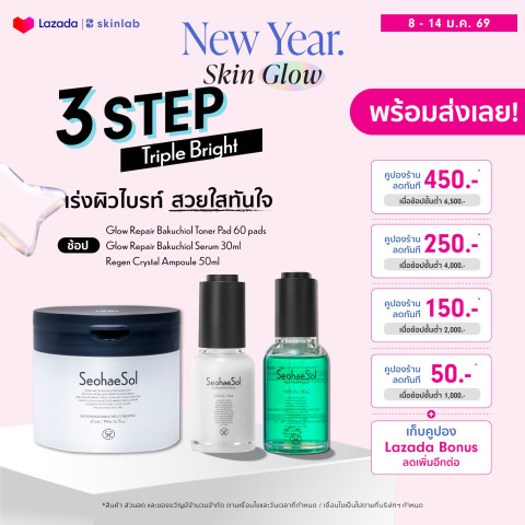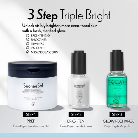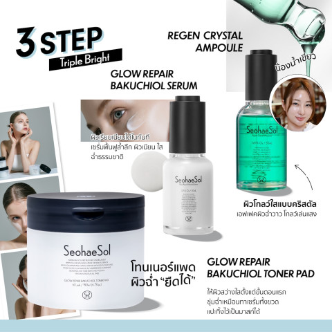 Seohaesol สกินแคร์เกาหลี 3 Items Triple Bright เซ็ทดูแลผิวแบบครบขั้นตอน เพื่อผิวไบรท์ สวยใสทันใจ ดูเปล่งประกายดุจคริสตัล เหมาะสำหรับผู้ที่ต้องการกู้ผิวหมองคล้ำให้กลับมาดูเรียบเนียน กระจ่างใส และชุ่มชื้นอย่างเป็นธรรมชาติ ด้วยส่วนผสมเด่นอย่าง Bakuchiol (ทางเลือกอ่อนโยนของเรตินอล) ที่ช่วยดูแลผิวให้แลดูเรียบเนียน พร้อมบำรุงให้ผิวดูอิ่มฟูและสุขภาพดี
