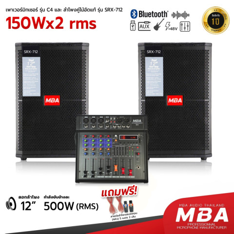 MBAAUDIOTHAILAND ชุดลำโพงคาราโอเกะ 12 นิ้ว เสียงดีกำลัง 500 วัตต์ พร้อมเพาเวอร์มิกซ์ 4 ช่อง มีบลูทูธ ชุดเครื่องเสียงครบเซ็ตสำหรับสายคาราโอเกะ งานปาร์ตี้ ร้านอาหาร ห้องซ้อม หรือใช้งานอีเวนต์ขนาดย่อม ให้เสียงแน่น ชัด มีมิติ ปรับแต่งเสียงได้อิสระด้วยเพาเวอร์มิกเซอร์ 4 ช่อง พร้อมเอฟเฟกต์ในตัวและ Bluetooth เชื่อมต่อเพลงได้สะดวก เปิดปุ๊บร้องได้ทันที