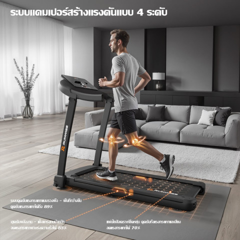 ครอบคลุมตั้งแต่เดินชิล ฟื้นฟูร่างกาย ไปจนถึงวิ่งซ้อมแบบเข้มข้น ปรับจังหวะได้ง่ายเพียงปลายนิ้วระบบลดแรงกระแทก 4 ระดับ (พัฒนาขึ้นเอง)