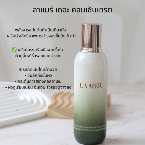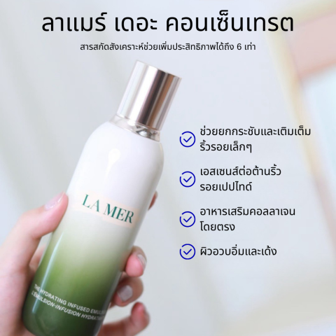 La Mer The Hydrating Infused Emulsion 125 ml อิมัลชั่นบำรุงผิวระดับลักชัวรี เนื้อบางเบาแต่ให้ความชุ่มชื้นแบบเข้มข้น ช่วยเติมน้ำให้ผิวทันทีและคงความอิ่มฟูยาวนาน ผิวดูเรียบเนียน ฉ่ำโกลว์ สุขภาพดี โดยไม่ทิ้งความมันหรือความเหนอะหนะ เหมาะสำหรับทุกสภาพผิว โดยเฉพาะผิวแห้งและผิวขาดน้ำที่ต้องการการฟื้นบำรุงเป็นพิเศษ