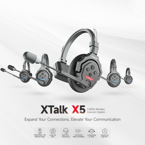 Synco XTalk X5 ชุดหูฟังอินเตอร์คอมไร้สายสำหรับทีมงาน รองรับ 5 คน สนทนาได้พร้อมกันแบบ Full Duplex ช่วยให้การสื่อสารในกองถ่าย งานอีเวนต์ งานโปรดักชัน และงานทีมภาคสนามเป็นไปอย่างลื่นไหล ชัดเจน และทำงานได้รวดเร็วขึ้น ลดการตะโกนสั่งงานหรือการเดินไปมาสื่อสารให้เสียเวลา