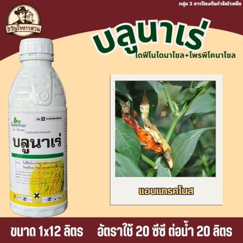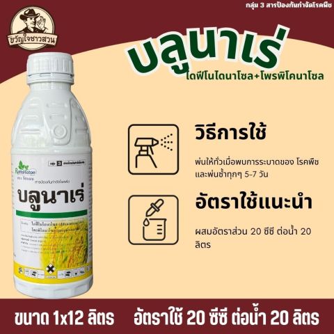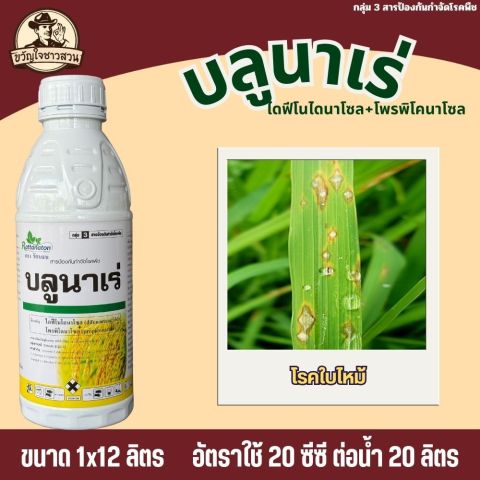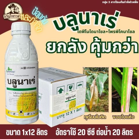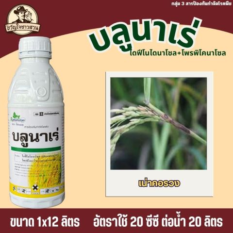 บลูนาเร่ (ยกลัง 12 ลิตร) สารออกฤทธิ์ ไดฟีโนโคนาโซล + โพรพิโคนาโซล สำหรับป้องกันและรักษา โรคกาบใบแห้ง (Sheath Blight) ในข้าว ช่วยหยุดการลุกลามของเชื้อรา ลดความเสียหายของใบและกาบใบ ทำให้ต้นข้าวแข็งแรง ใบเขียวสวย ส่งผลให้ เมล็ดเต่ง คุณภาพผลผลิตดี เหมาะกับช่วงอากาศร้อนชื้นที่โรคระบาดรุนแรง