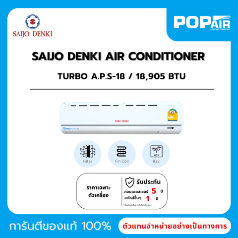แอร์ SAIJO DENKI (ซัยโจ เด็นกิ) Fixed-Speed 18000 BTU รุ่น TURBO APS R32-18 รุ่นยอดนิยมสำหรับบ้านและออฟฟิศที่ต้องการความเย็นเร็ว คุ้มค่า ทนทาน พร้อมระบบฟอกอากาศโอโซนมาตรฐานเดียวกับที่ใช้ในห้องผ่าตัด ช่วยยกระดับความสะอาดของอากาศภายในห้อง เหมาะกับผู้ที่ใส่ใจสุขภาพและคุณภาพชีวิต