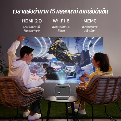ความสว่างระดับ 1200 ANSI (ระบุสูงสุด 16000 ลูเมน) ให้ภาพสว่างคมชัด ใช้งานได้ดีแม้ในเวลากลางวัน พร้อมความละเอียดมาตรฐาน Full HD 1080P (1920×1080) และรองรับการถอดรหัส 4K HD เก็บรายละเอียดครบ สีสันสดขึ้นด้วยเอนจินปรับภาพโฟกัสไฟฟ้า + แก้คีย์สโตนด้วยมอเตอร์