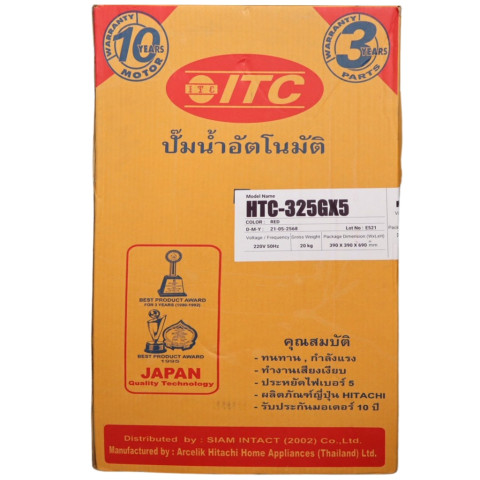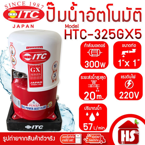 ปั๊มน้ำ ITC (ไอทีซี) รุ่น HTC-325GX5 ปั๊มน้ำอัตโนมัติแรงดันคงที่ ขนาด 300 วัตต์ ให้แรงดันน้ำสม่ำเสมอ เปิดก๊อกพร้อมกันก็ยังไหลดี เหมาะสำหรับบ้านพักอาศัย 1–2 ชั้น ช่วยยกระดับความสะดวกสบายในชีวิตประจำวัน พร้อมความมั่นใจด้วย รับประกันมอเตอร์นาน 10 ปี