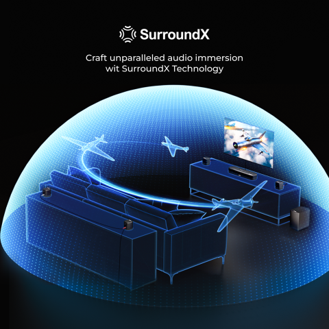 มาพร้อมลำโพงเซอร์ราวด์หน้าแบบมีสาย 2 ตัว และลำโพงเซอร์ราวด์หลังแบบมีสาย 2 ตัว โดยชุดลำโพงหลังสามารถเชื่อมต่อกับซาวด์บาร์แบบไร้สาย (ตามการออกแบบระบบ) เพื่อลดความรกของสายและช่วยจัดพื้นที่ให้เรียบร้อยDolby Atmos สร้างซาวด์สเคป 3D โอบล้อมรอบตัว