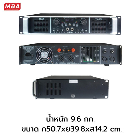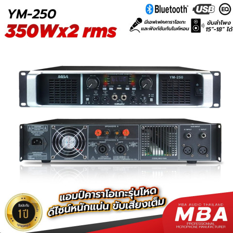 MBASOUNDTHAILAND เพาเวอร์แอมป์ รุ่น YM-250 เพาเวอร์แอมป์กำลังขับสูง ให้พลังเสียงเต็มอิ่ม คมชัด เหมาะสำหรับงานคาราโอเกะ งานอีเวนต์ขนาดย่อม ร้านค้า ห้องซ้อม หรือชุดเครื่องเสียงกลางแจ้ง ด้วยกำลังขับ 350 x 2W (รวมสูงสุด 700W RMS) รองรับลำโพงขนาด 12–15 นิ้ว (และสามารถขับดอก 15 หรือ 18 นิ้ว ได้) พร้อมฟังก์ชันครบทั้ง Bluetooth และ USB/MP3 ใช้งานสะดวก จบในเครื่องเดียว