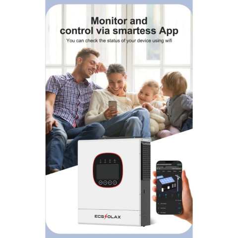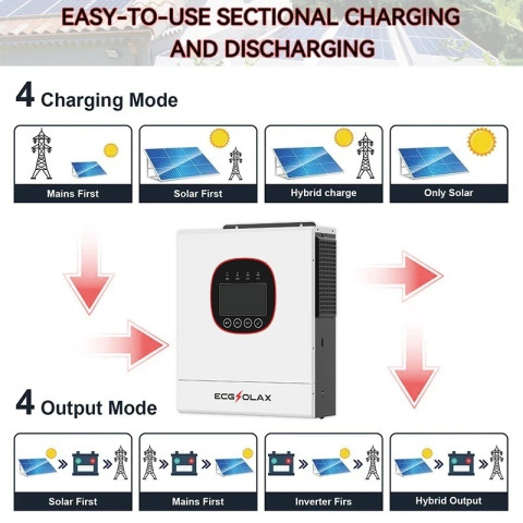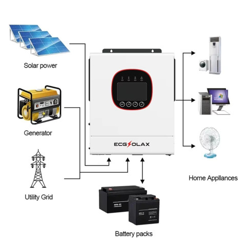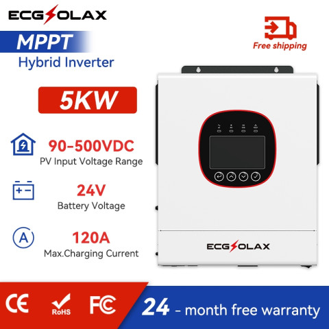 ECG 5000W Off-Grid/On-Grid Pure Sine Wave Solar Hybrid Inverter 24V MPPT 160A อินเวอร์เตอร์ไฮบริดพลังงานแสงอาทิตย์แบบมัลติฟังก์ชั่นจาก ECGSOLAX ของแท้ 100% รวม MPPT Solar Charge Controller, Pure Sine Wave Inverter และ UPS ไว้ในเครื่องเดียว เหมาะทั้งงานสำรองไฟและระบบโซลาร์นอกกริด/ออนกริด พร้อมจุดเด่นสำคัญคือ สามารถทำงานได้โดยไม่ต้องใช้แบตเตอรี่ เพิ่มความยืดหยุ่นในการติดตั้งและลดต้นทุนอุปกรณ์