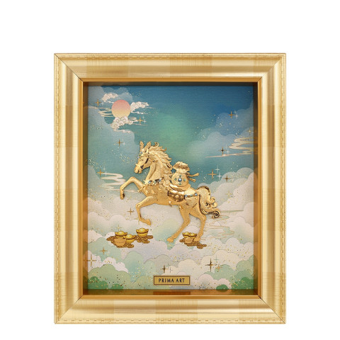 PRIMA ภาพหัตถศิลป์อาชาสวรรค์สง่างาม งานศิลป์แผ่นทองคำที่ถ่ายทอดความสง่างามของ “ม้า” อันเป็นสัญลักษณ์แห่งความกระตือรือร้น เข้มแข็ง ปราดเปรียว สื่อถึงความก้าวหน้าในหน้าที่การงาน ความสำเร็จ และความเจริญรุ่งเรืองของชีวิต เหมาะอย่างยิ่งสำหรับมอบเป็นของขวัญแทนใจแก่ผู้ที่เคารพรัก หรือใช้ตกแต่งบ้าน ร้านค้า และสำนักงานให้โดดเด่นอย่างมีสิริมงคล