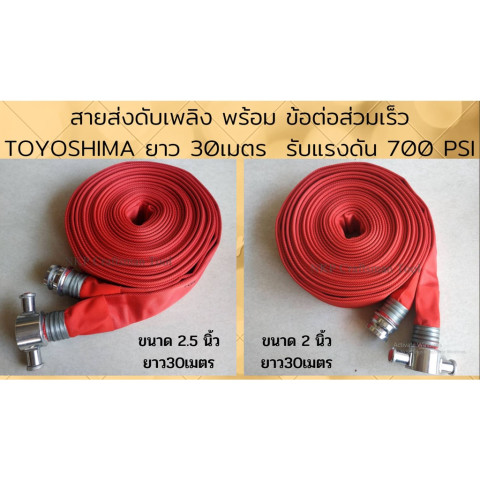 สายส่งดับเพลิง พร้อมข้อต่อสวมเร็ว TOYOSHIMA สำเร็จรูปพร้อมใช้งาน ขนาด 2 นิ้ว (มีตัวเลือก 2.5 นิ้ว) ความยาว 30 เมตร รองรับแรงดันสูงสุดถึง 700 PSI เหมาะสำหรับงานดับเพลิง งานอุตสาหกรรม และงานระบบน้ำที่ต้องการความทนทานและความมั่นใจในการใช้งานจริง ติดตั้งและเชื่อมต่อได้รวดเร็วด้วยข้อต่อสวมเร็ว ช่วยประหยัดเวลาในสถานการณ์เร่งด่วน