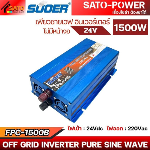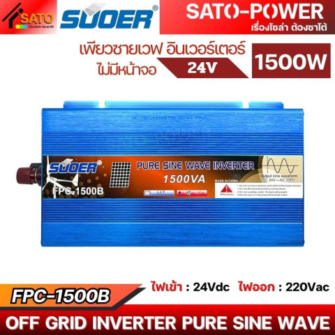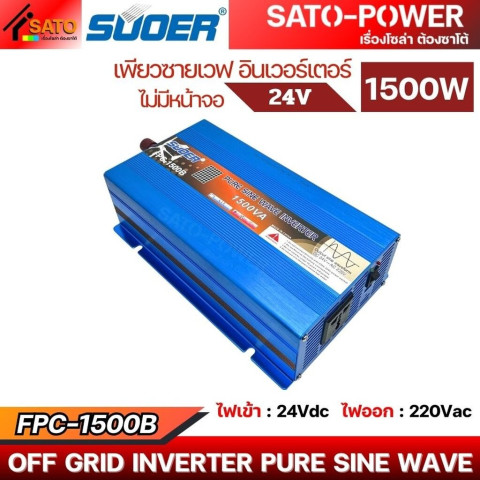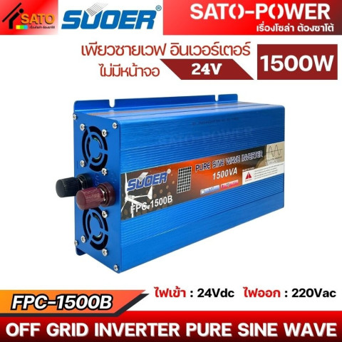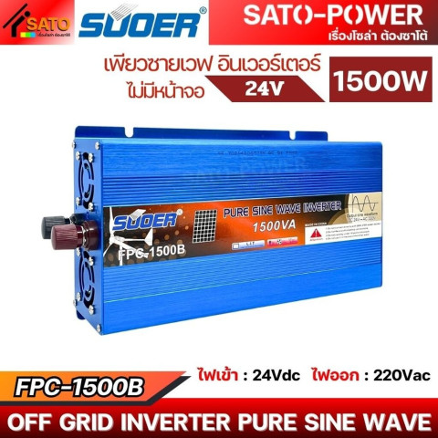 SUOER อินเวอร์เตอร์ FPC-1500B 24V Pure Sine Wave กำลังไฟ 1500W คืออินเวอร์เตอร์คุณภาพสูงที่ออกแบบมาเพื่อการแปลงไฟ DC 24V จากแบตเตอรี่หรือระบบโซลาร์ ให้เป็นไฟฟ้า AC แบบคลื่นไซน์แท้ (Pure Sine Wave) เหมาะสำหรับใช้งานกับเครื่องใช้ไฟฟ้าหลากหลายประเภท ทั้งในบ้าน รถยนต์ รถบรรทุก รถแคมป์ หรือระบบพลังงานแสงอาทิตย์