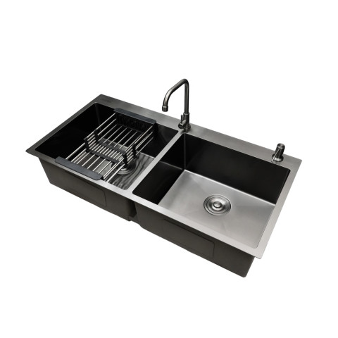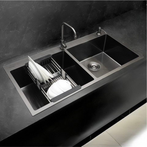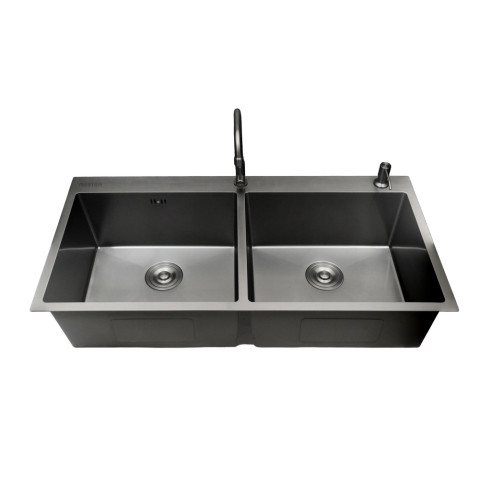 ด้วยดีไซน์หลุมล้างคู่ขนาดใหญ่ มุมโค้งรัศมีเพียง 10 มม. ให้ลุคเรียบหรู สไตล์โมเดิร์น ทำความสะอาดง่าย ลดการสะสมคราบ ตัวหลุมออกแบบให้กว้างและลึกเป็นพิเศษ ช่วยให้ล้างหม้อใบใหญ่ กระทะ หรืออุปกรณ์ครัวหลายชิ้นได้พร้อมกันอย่างสะดวก ไม่กระเด็นเลอะพื้นเคาน์เตอร์