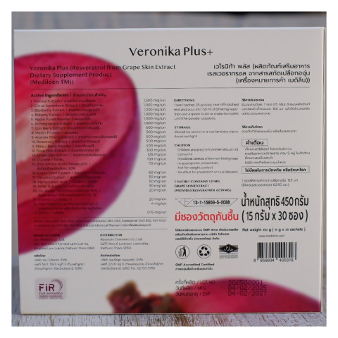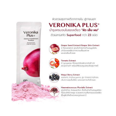 Veronika (เลขที่ อย. 13-1-15859-5-0088) เป็นผลิตภัณฑ์แบบชงดื่มสูตรเข้มข้น ช่วยให้ผิวดู: