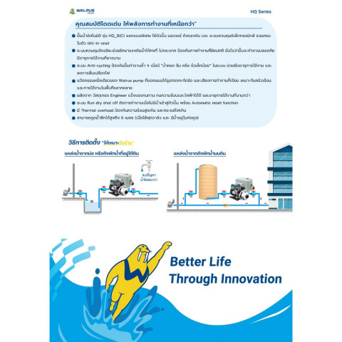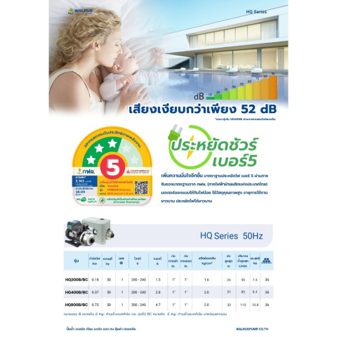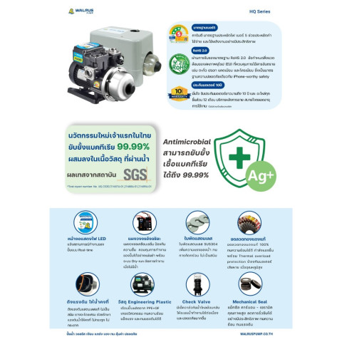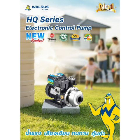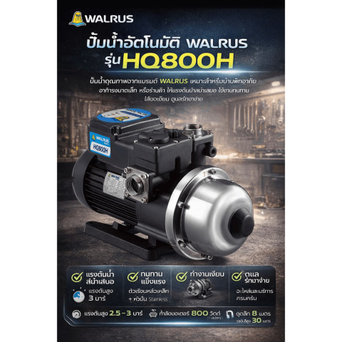 WALRUS ปั๊มน้ำอัตโนมัติ HQ SERIES รุ่นใหม่ล่าสุด ใบพัดสแตนเลส SUS304 ของแท้ มาพร้อมเทคโนโลยีจากไต้หวัน ให้แรงดันน้ำสม่ำเสมอ ทำงานเสถียร เงียบ และประหยัดพลังงาน เหมาะทั้งบ้านพักอาศัยและงานระบบน้ำที่ต้องการความทนทานสูง