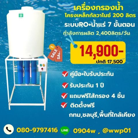 เครื่องกรองน้ำโครงเหล็กกัลวาไนซ์ 200 ลิตร ผลิต 2,400 ลิตร/วัน ราคา 14,006.00 บาท เหมาะสำหรับบ้านพัก ร้านอาหาร ออฟฟิศ โรงงาน หรือหน่วยงานที่ต้องการน้ำดื่มปริมาณมากต่อเนื่อง พร้อมถังสำรองขนาด 200 ลิตร ให้มีน้ำพร้อมใช้งานตลอดวัน