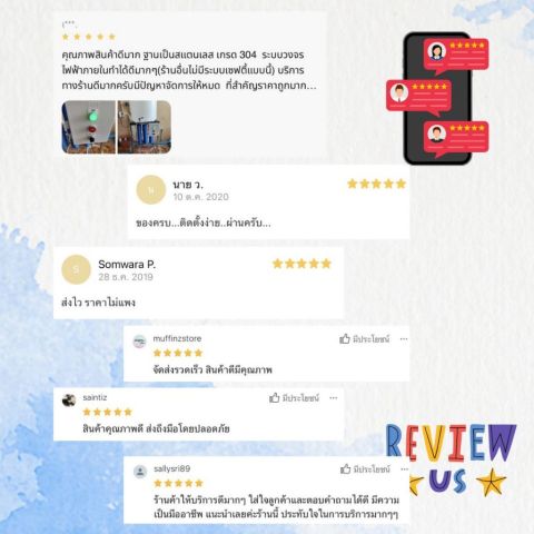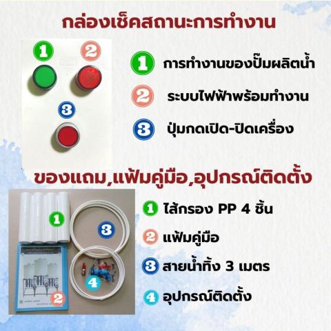 ระบบการกรอง: Reverse Osmosis (RO) 5 ขั้นตอน (พร้อมไส้กรองรวม 6 ขั้นตอนตามรายการ)