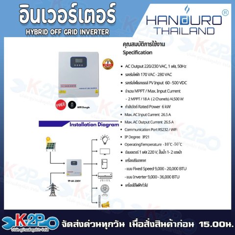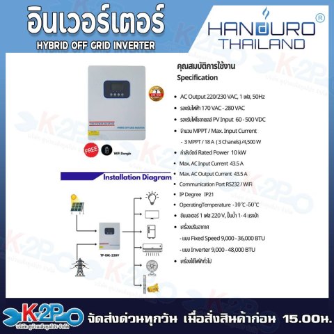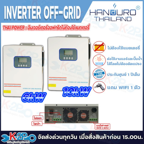 THAI POWER By HANDURO INVERTER HYBRID OFF GRID อินเวอร์เตอร์ไฮบริดออฟกริด “ไม่ต้องใช้แบตเตอรี่” ออกแบบมาให้ใช้งานง่าย ติดตั้งสะดวก ไม่ต้องดัดแปลง เหมาะสำหรับบ้านพักอาศัย ร้านค้า ฟาร์ม และงานเกษตรที่ต้องการใช้พลังงานจากโซลาร์เซลล์แบบคุ้มค่า ขับปั๊มน้ำได้ ใช้กับแอร์ได้ พร้อม แถมฟรี WiFi สำหรับดูสถานะ/การทำงานผ่านระบบมอนิเตอร์ รองรับการใช้งานได้ทั้งรุ่น 6kW และ 10kW (กำลังสูงสุดตามรุ่น)