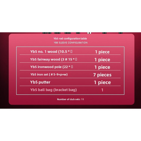 การจัดชุด: ไม้ 2 + เหล็ก 7 + พัตเตอร์ 1 + ไฮบริด 1 + ถุง รวม 11 ชิ้น
