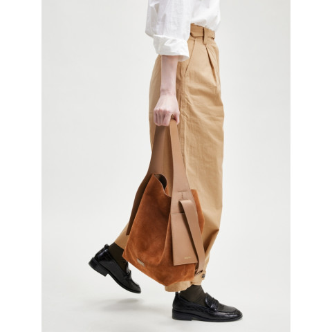 ถือได้ 3 แบบ ถือด้วยมือ / สะพายไหล่ / สะพายข้าง ด้วยสายสะพายหนังลูกวัว “สองด้าน” ถอดได้