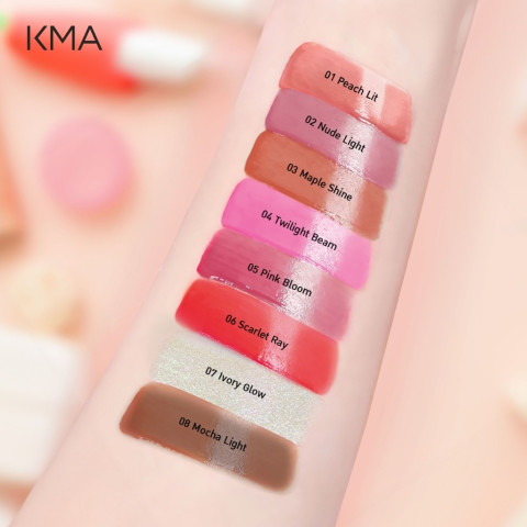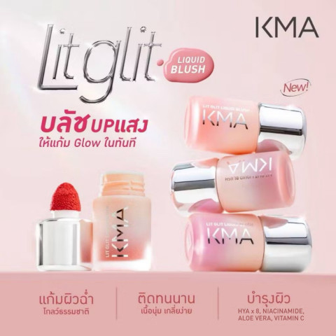 สัมผัสลุคแก้มโกลว์ใสสุขภาพดีแบบเป็นธรรมชาติด้วย [NEW] KMA Lit Glit Liquid Blush 5 g. บลัชออนเนื้อลิควิดบางเบา เกลี่ยง่าย สีละมุนแต่ติดทนนาน พร้อมมอบการบำรุงผิวในหนึ่งเดียว เหมาะสำหรับทุกวัน ทุกโทนผิว และทุกสไตล์การแต่งหน้า