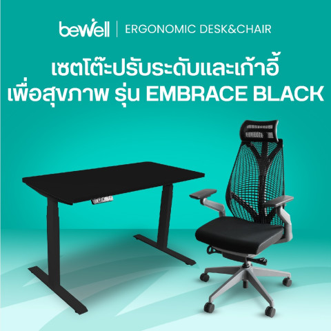 เซ็ตโต๊ะและเก้าอี้เพื่อสุขภาพ Bewell Ergonomic Desk&Chair รุ่น Embrace สีดำ ออกแบบมาเพื่อคนทำงานยุคใหม่ที่ต้องนั่งทำงานเป็นเวลานาน ให้คุณเปลี่ยนมุมทำงานธรรมดาให้กลายเป็นมุมดูแลสุขภาพ ด้วยโต๊ะทำงานปรับระดับไฟฟ้า และเก้าอี้เพื่อสุขภาพระดับพรีเมียม ช่วยลดอาการเมื่อยล้า ดูแลทั้งหลัง คอ ไหล่ และขา ให้คุณทำงานได้อย่างมีสมาธิและมีประสิทธิภาพมากขึ้น ในราคาคุ้มค่าที่ทุกคนจับต้องได้ เพียง 37,584 บาท