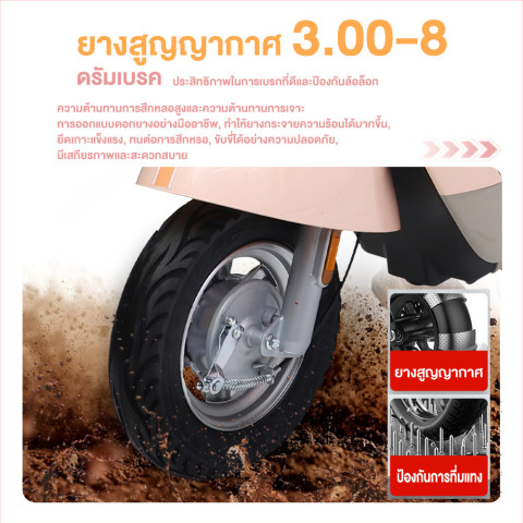 ตัวรถติดตั้งยางสูญญากาศขนาด 3.0-8 แบบกันลื่น ช่วยยึดเกาะถนนได้ดีแม้ทางเปียก พร้อมระบบเบรกดรัมหน้า-หลัง เพิ่มความปลอดภัยขณะขับขี่ ชุดไฟหน้า LED สว่างชัดเจน รวมถึงไฟเลี้ยวหน้า-หลัง และไฟท้าย ครบสำหรับการขับขี่ในเวลากลางคืนหรือที่แสงน้อย