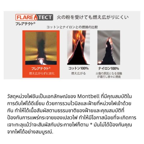 ทนประกายไฟ เหมาะกับแคมป์ปิ้ง วัสดุช่วยลดการลามของไฟและมีคุณสมบัติ ดับเองได้ (self-extinguishing) เมื่อพ้นจากแหล่งเปลวไฟ